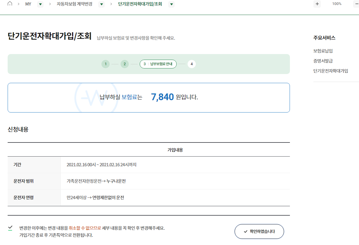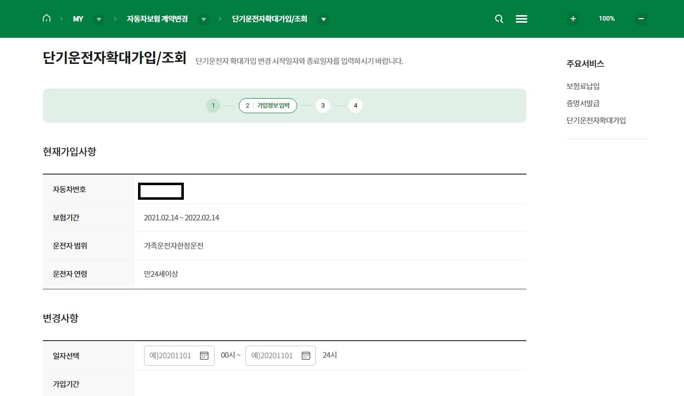 로그인 후에 옆에 있는 단기운전자확대가입을 들어갑니다.